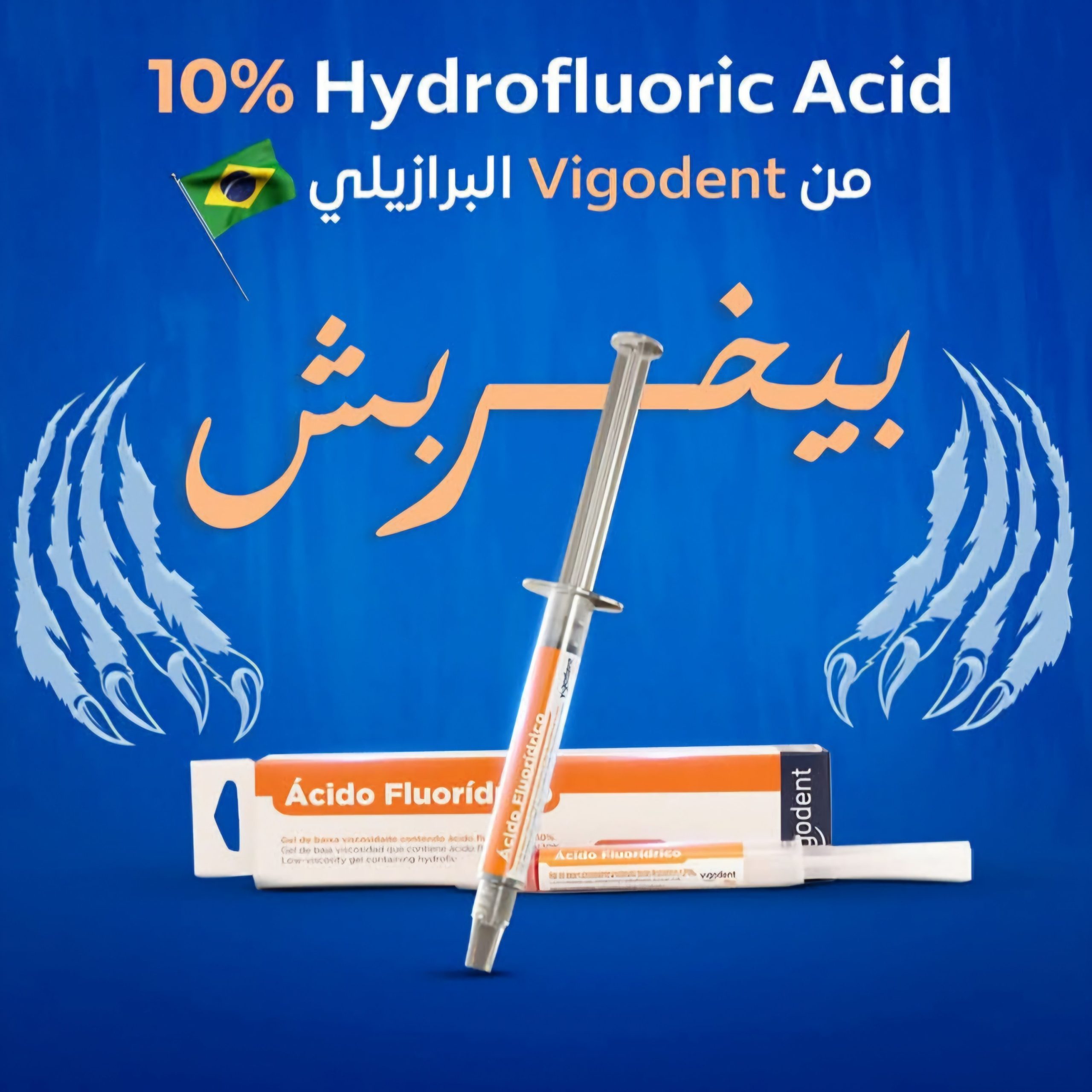 Gel based on 10% hydrofluoric acid for conditioning ceramics. This acid provides excellent consistency, easy application and removal, as well as excellent effectiveness in conditioning porcelain. It has a contrasting color with the ceramic pieces for better visualization.